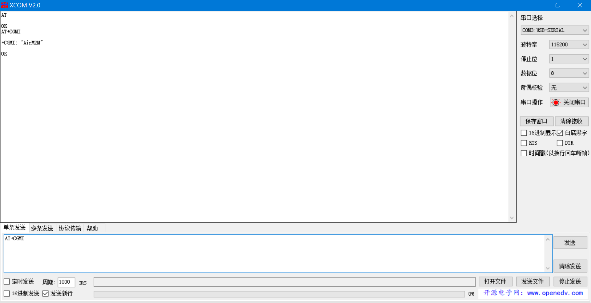说明: 第一次发送AT 过去时,模块会匹配波特率,模块会自适应波特率; 第二次发送AT就会返回OK。