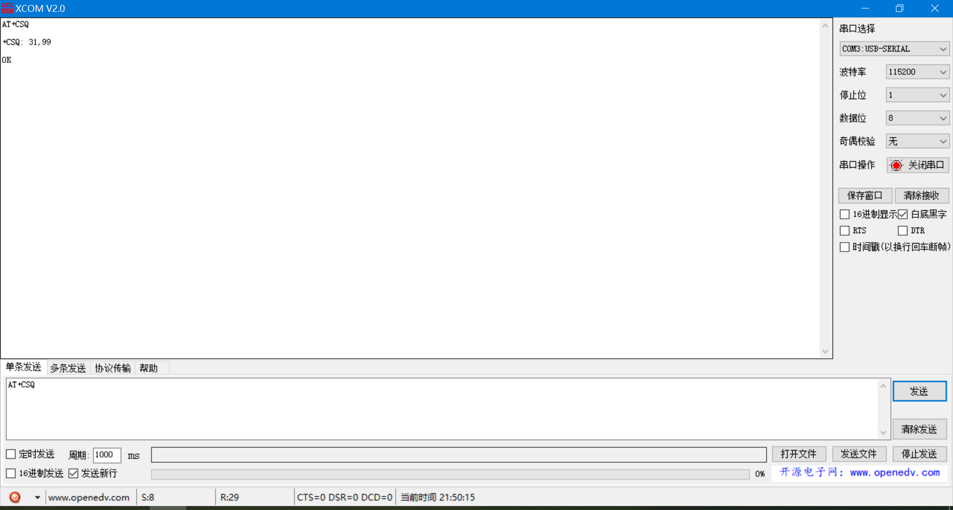 查询模组的信号强度,第一个值为0-31则正常,99为不正常。