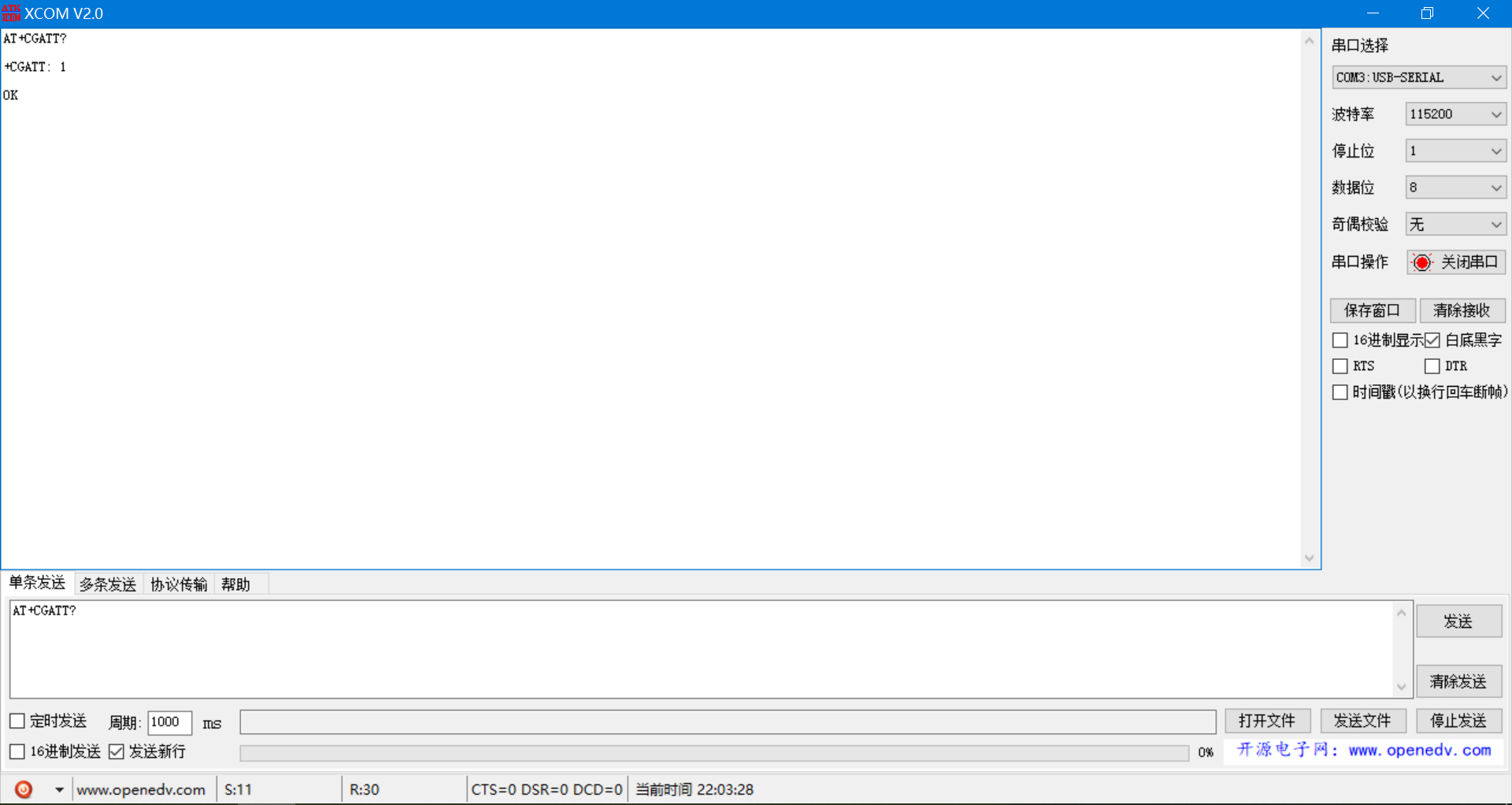 +CGATT:1 OK 状态=1,标明当前GPRS已经附着.