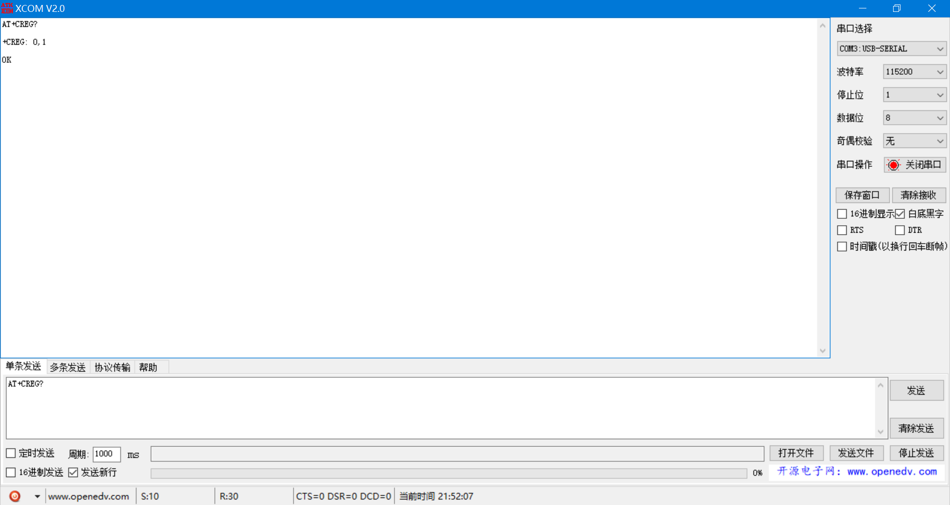 查询模组是否注册上GSM网络,+CREG:0,1 表示已注册上本地网,+CREG:0,5表示注册上漫游网。