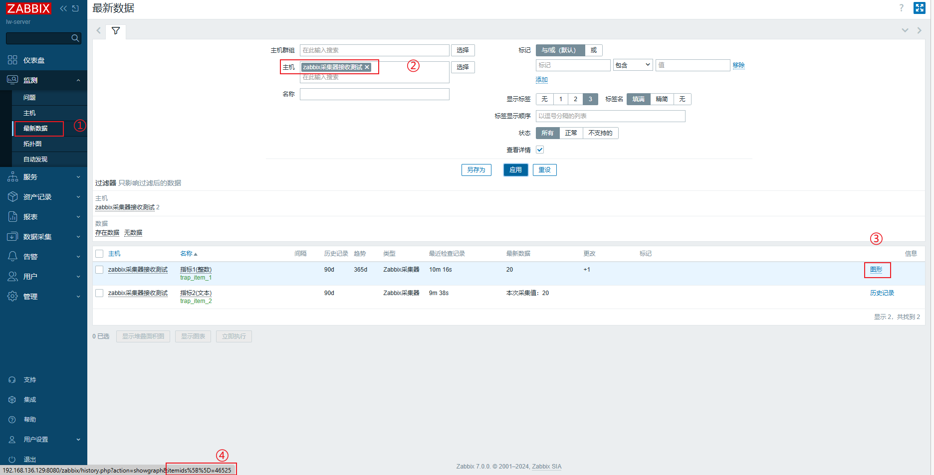 从最新数据中指标详情按钮,可查看左下角出现的超链中包含监控项的itemid