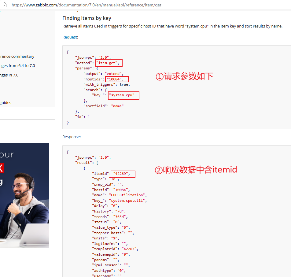 参考官方手册item.get (zabbix.com) ,通过指定主机ID及键值名称,可获取item详情,返回数据中包含itemid