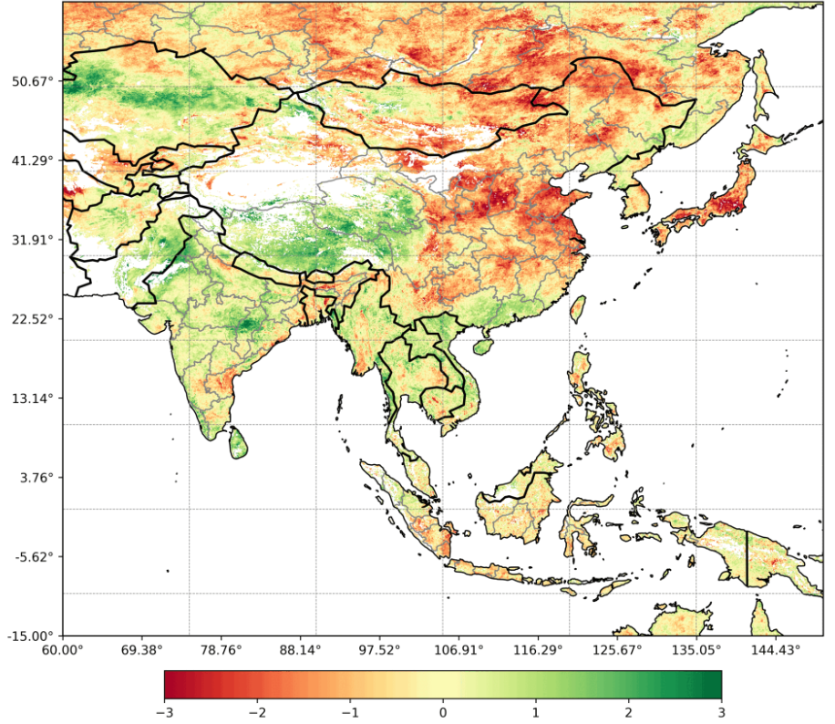 图2 东南亚及南亚2024年5月8日干旱指数分布图