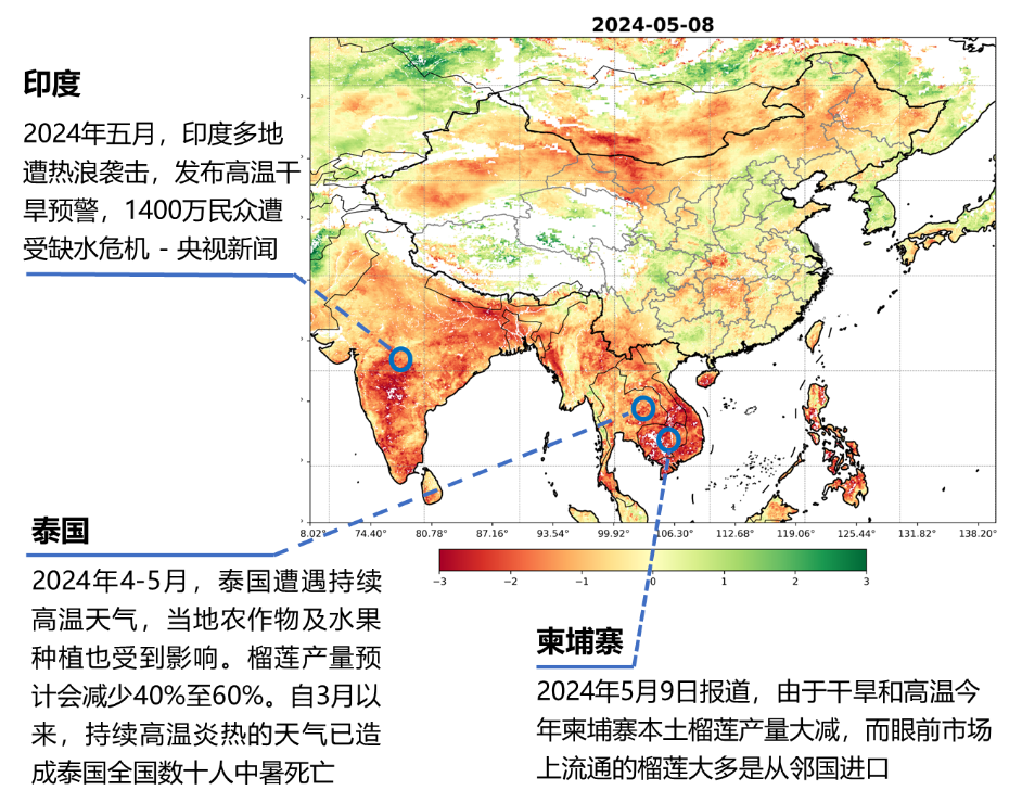慧天卓特干旱产品基于风云系列卫星观测数据,物理反演地表干旱指数FYDI,对中国及东南亚地区提供逐日4KM分辨率的精准干旱监测,并具备预测预警功能,图1为东南亚及南亚2023年月平均干旱指数分布动态图。许多亚洲国家在2023年经历了有记录以来最热的一年,还出现了干旱、热浪、洪水、暴雨等一系列极端气候状况。进入2024年后,受厄尔尼诺的持续影响,很多亚洲国家仍处于高温干旱中,今年五月,东南亚多过同时遭受旱灾(图2)。印度多地遭热浪袭击,发布高温干旱预警,1400万民众遭受缺水危机。泰国、柬埔寨也遭遇了持续的高温干旱,农作物及水果种植也受到影响,两国榴莲产量受到严重影响。