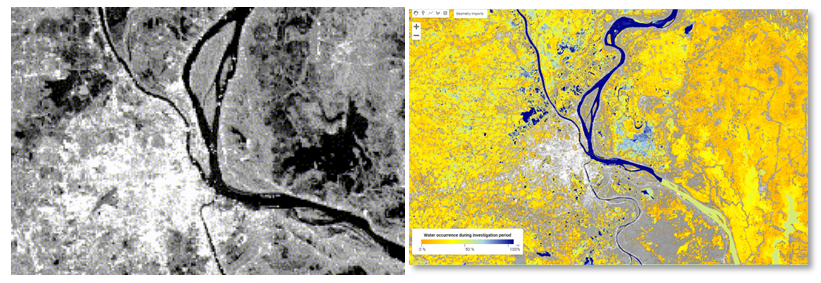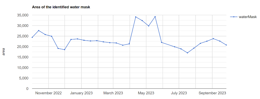湄公河流域涵盖多个国家,是一个农业生产密集区,也是自然灾害频发的区域,柬埔寨位于湄公河下游区域。2023年柬埔寨金边区域水体面积的时间序列识别显示(图4),5月受强降水影响,水体面积剧增。进一步,通过识别水体并监测水体面积变化,可生成金边地区水灾概率预测的产品(图5),有助于政府和相关部门制定防灾减灾措施,减少人员和财产损失。