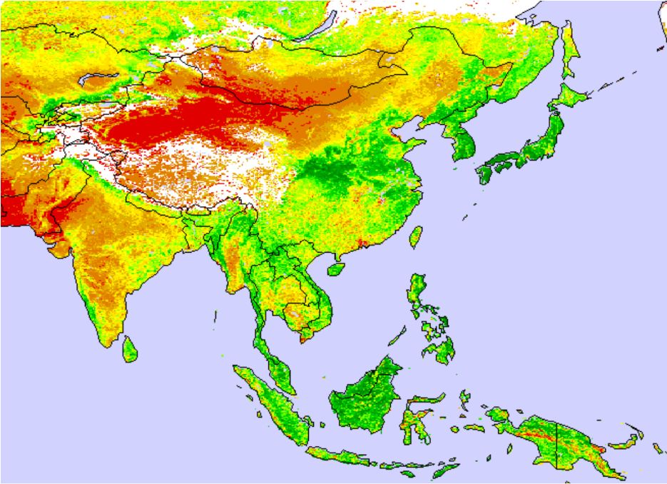 东南亚五月中的植被指数(图6)监测显示,东南亚区域整体植被覆盖度较高,缅甸中南部和泰国东部和柬埔寨部分区域的植被覆盖较低。