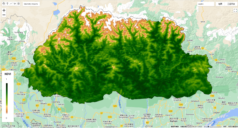 以不丹为例,从2020年-2024年不丹植被指数空间分布图(图7)不难看出植被覆盖度与地形高度呈现不同分布,即随着地形的升高,植被覆盖度呈现下降的趋势,在不丹北部海拔超过5000米的区域植被覆盖度呈现显著下降的趋势。图8为2020年-2024年不丹植被指数NDVI时序分布,从图中看出NDVI呈现周期变化,且呈现缓慢增长的趋势,表明该区域植被覆盖度呈现逐年增加的态势。每年10-11月植被覆盖度更高,5-9月植被覆盖度较低。