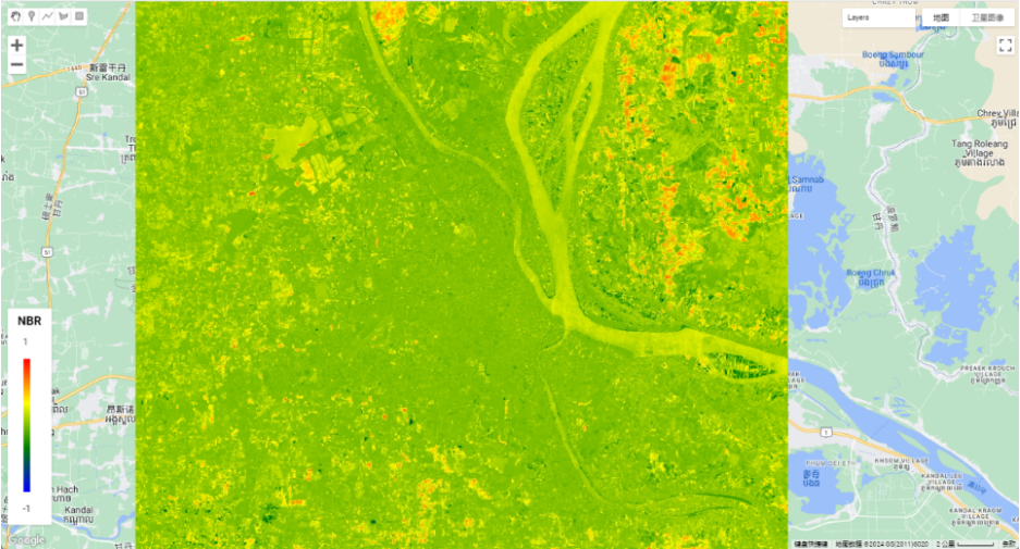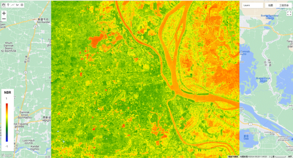 地表可燃物干燥缺水是造成火灾的主要原因之一,基于卫星遥感可对地表植被、干旱和地表水的状况进行反演,作为火险因子,用于火灾风险等级预测。 基于卫星遥感的归一化燃烧比指数NBR可用于监测火灾前后的植被变化,以评估火灾的影响和恢复情况。