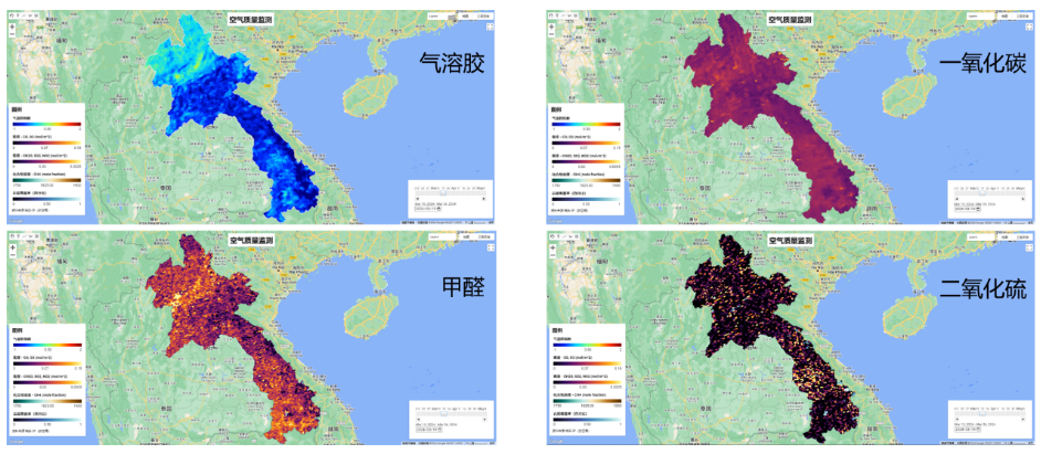 遥感大气产品可用于监测大气中的气溶胶、甲醛、一氧化碳、二氧化硫等污染物的浓度,提供空气质量评估和预警信息,对环境保护和公共健康管理具有重要意义。图11为老挝的主要空气污染物含量监测图。