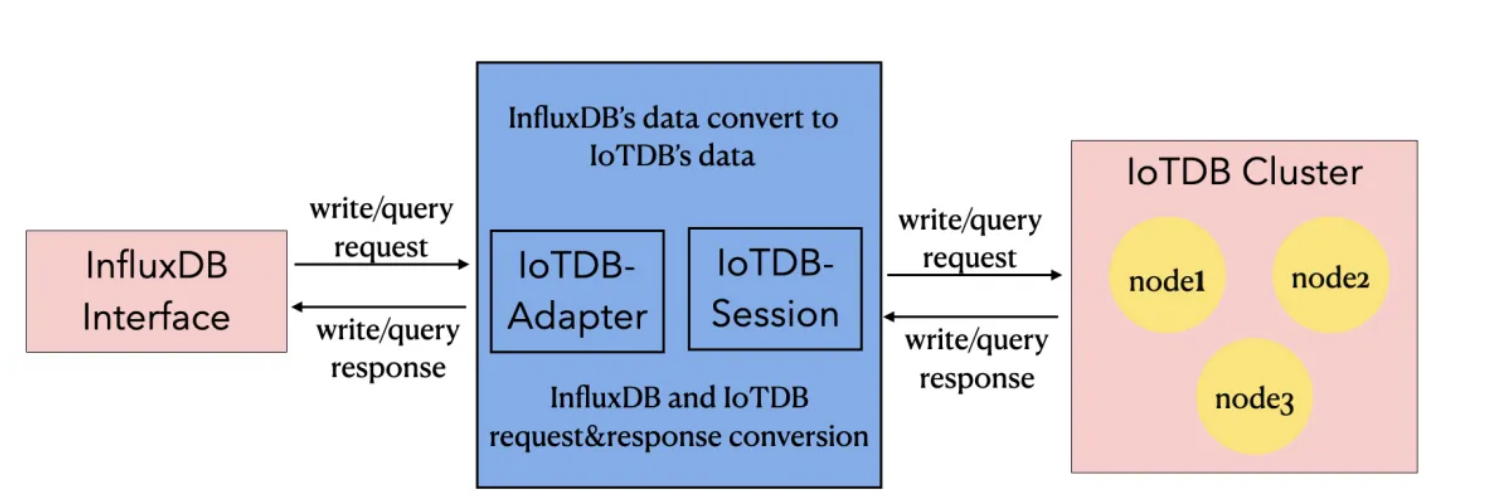 该适配器以 IoTDB Java ServiceProvider 接口为底层基础,实现了 InfluxDB 的 Java 接口 interface InfluxDB,对用户提供了所有 InfluxDB 的接口方法,最终用户可以无感知地使用 InfluxDB 协议向 IoTDB 发起写入和读取请求。
