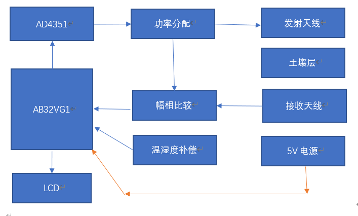 使用AB32VG1作为主控制器,配置高频产生电路产生900M高频信号,利用芯片自带的AD转换口采集幅相检测模块输出的模拟电压值。主控制器根据电磁波在土壤中和冬笋的反射介电常数不一样从而进行冬笋探测,并通过液晶显示。通过温湿度传感的补偿可以进一步提高测量精度。