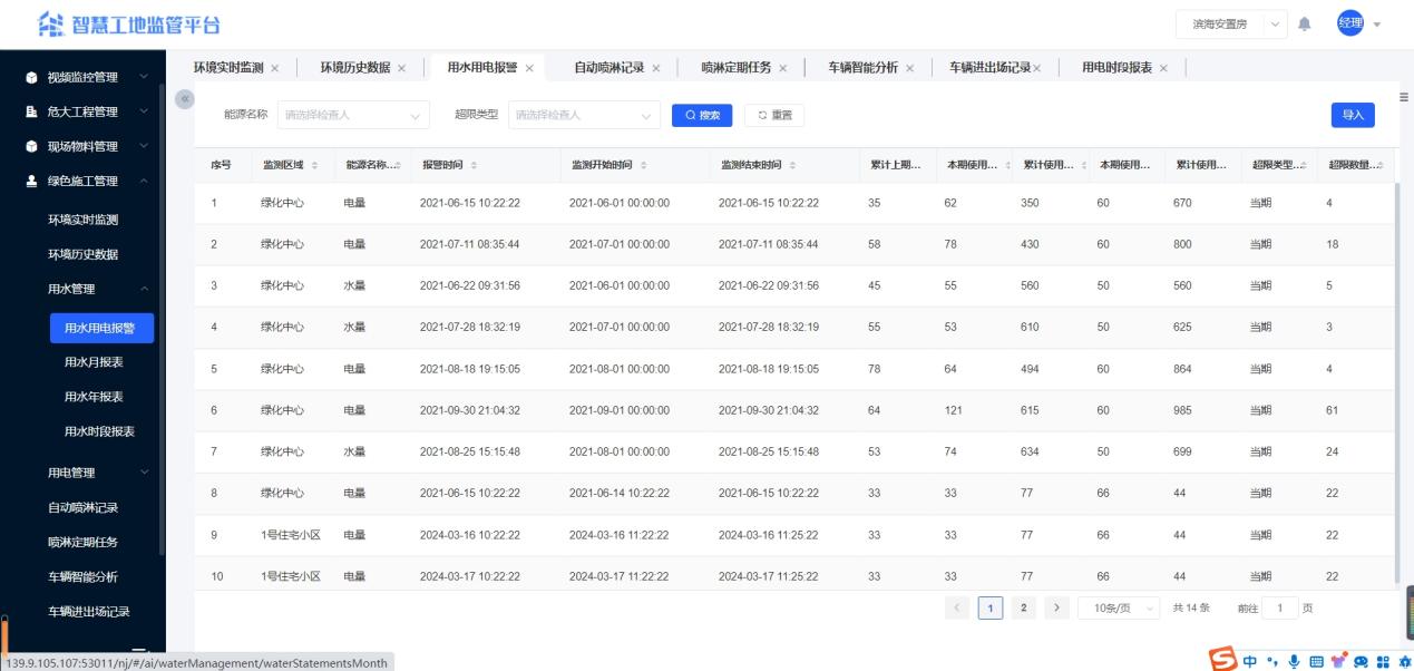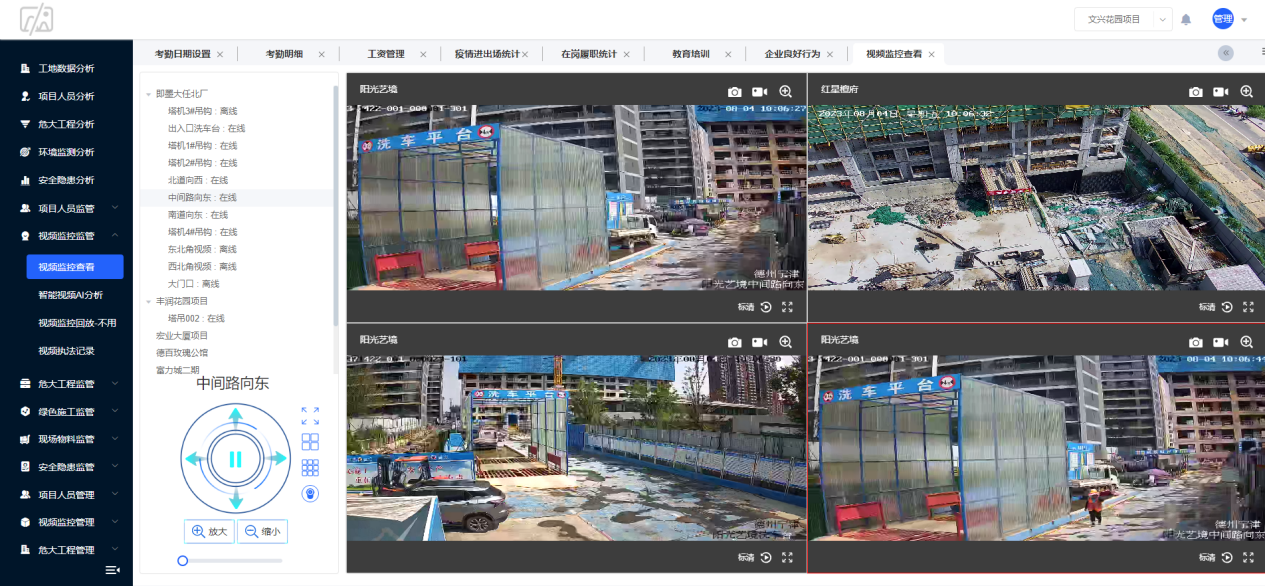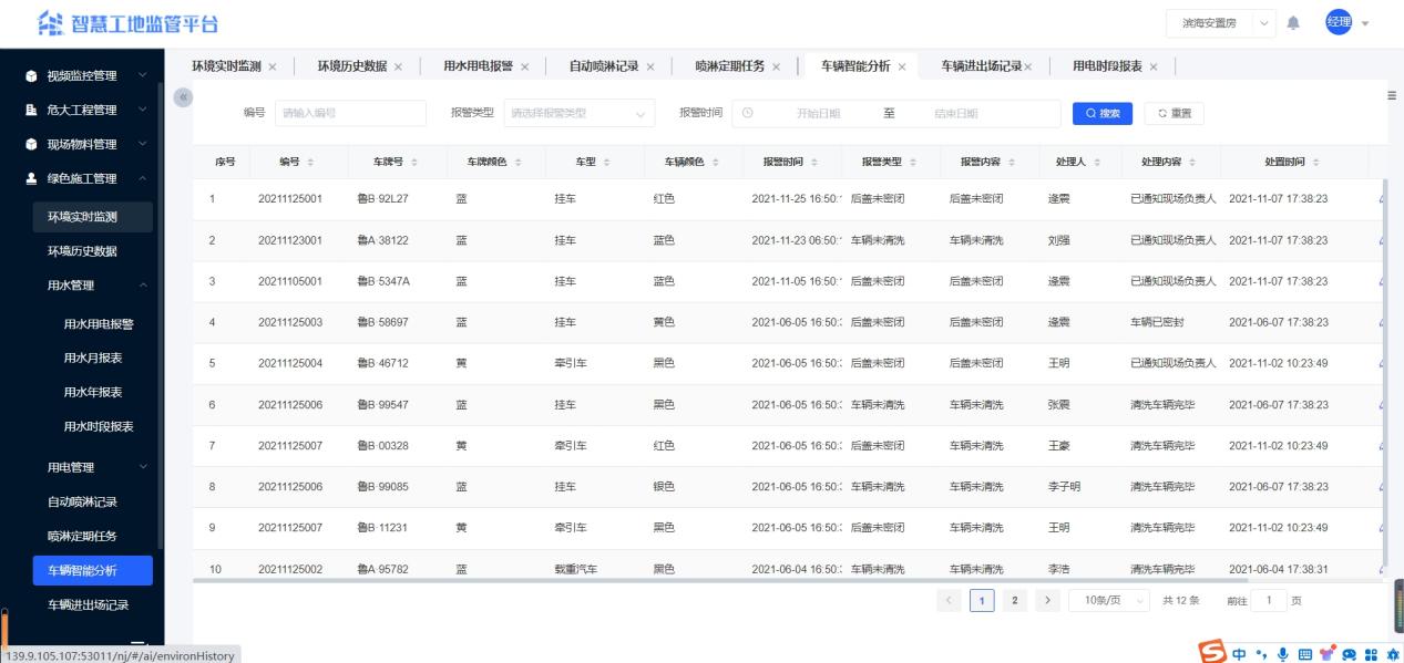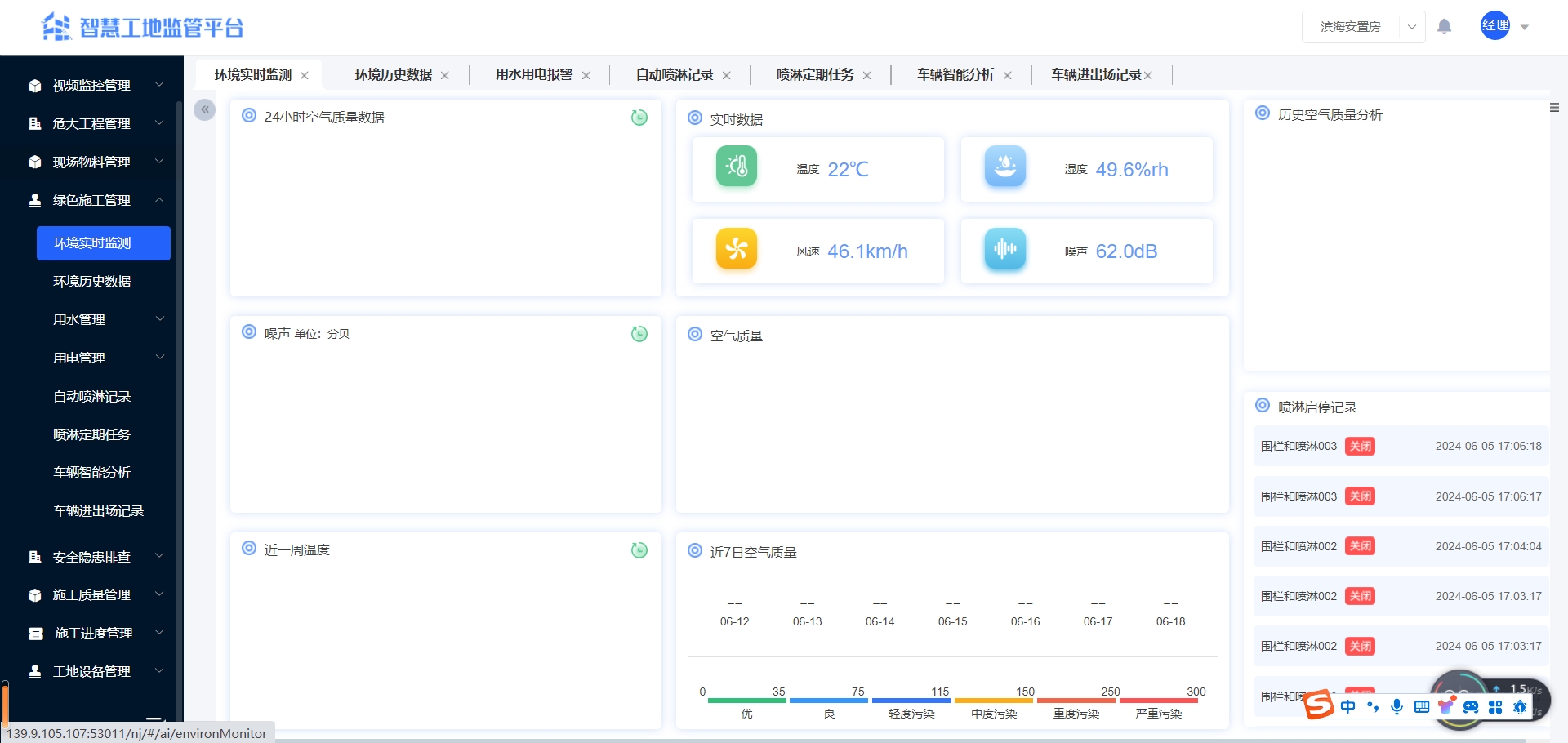 环境实时监测、环境监测历史数据、喷淋任务管理、自动喷漆记录、渣土车智能分析、车辆进出场记录