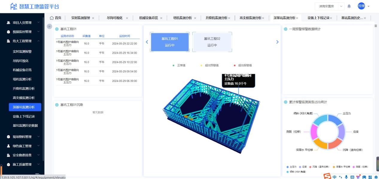 对深基坑的支护结构顶部水平位移、深层水平位移、立柱顶水平位移、沉降、支撑结构内力和锚索应力等数据实时监测,并对超警戒数据进行报警。