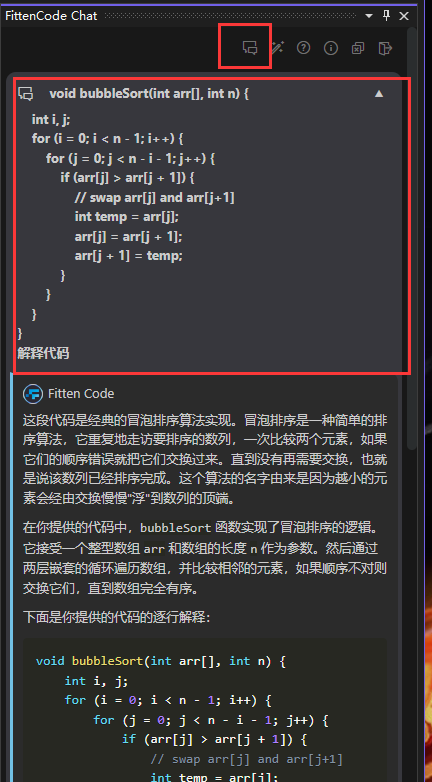 在开始新对话窗口向Fitten Code提问代码bug查找后,Fitten Code可以智能完成debug工作