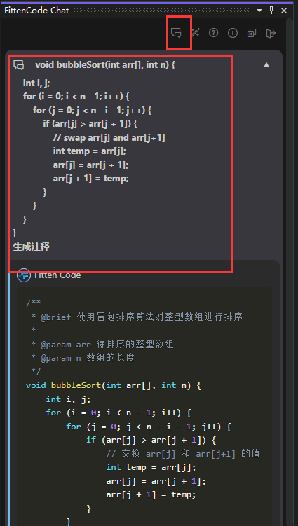 在开始新对话窗口向FittenCode提供需要编辑的代码段,并输入需求,Fitten可以完成代码编辑工作: