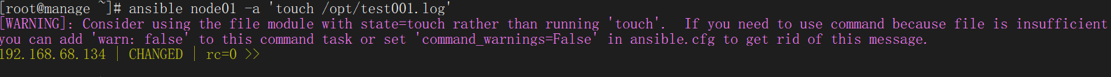 ansible node01 -a 'touch /opt/test001.log'