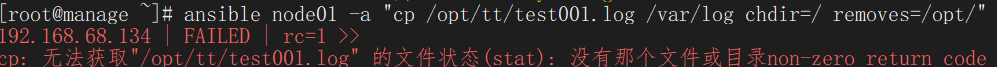 ansible node01 -a "cp /opt/tt/test001.log /var/log chdir=/ removes=/opt/"