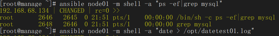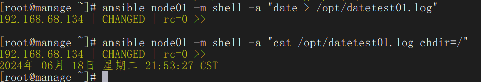 ansible node01 -m shell -a "date > /opt/datetest01.log"