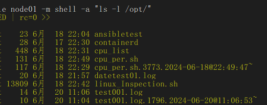 ansible node01 -m shell -a "cat /opt/datetest01.log chdir=/"
