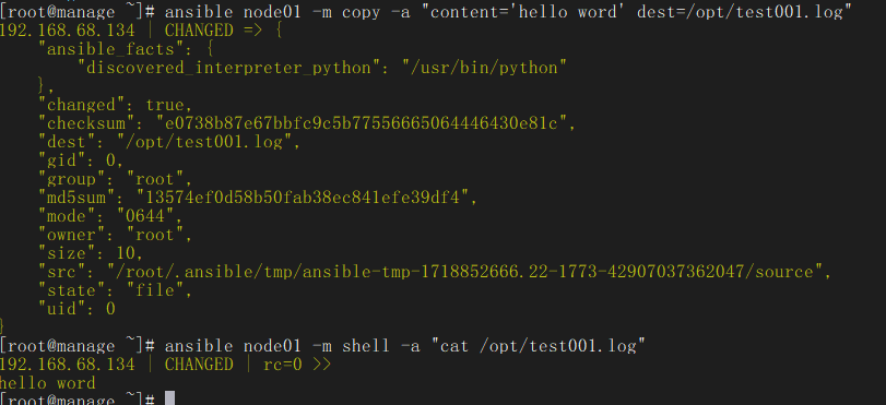 ansible node01 -m copy -a "content='hello word' dest=/opt/test001.log"