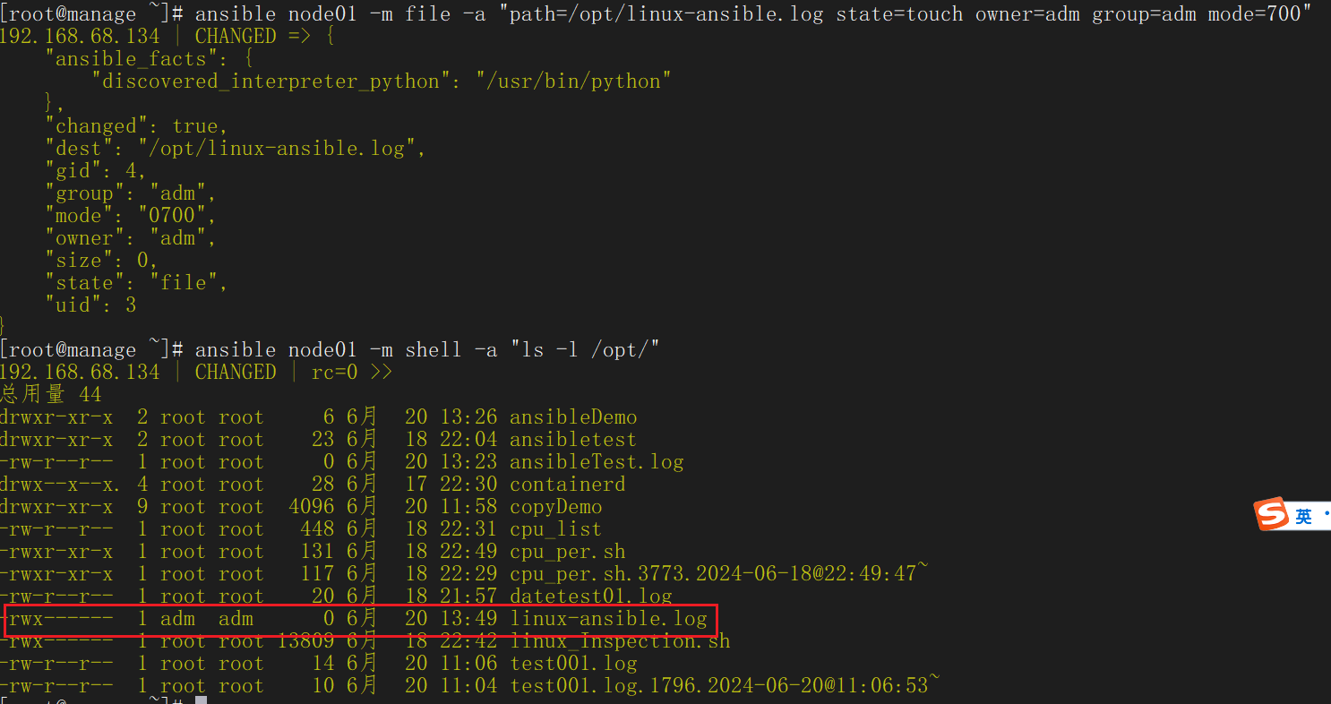 ansible node01 -m file -a "path=/opt/linux-ansible.log state=touch owner=adm group=adm mode=700"