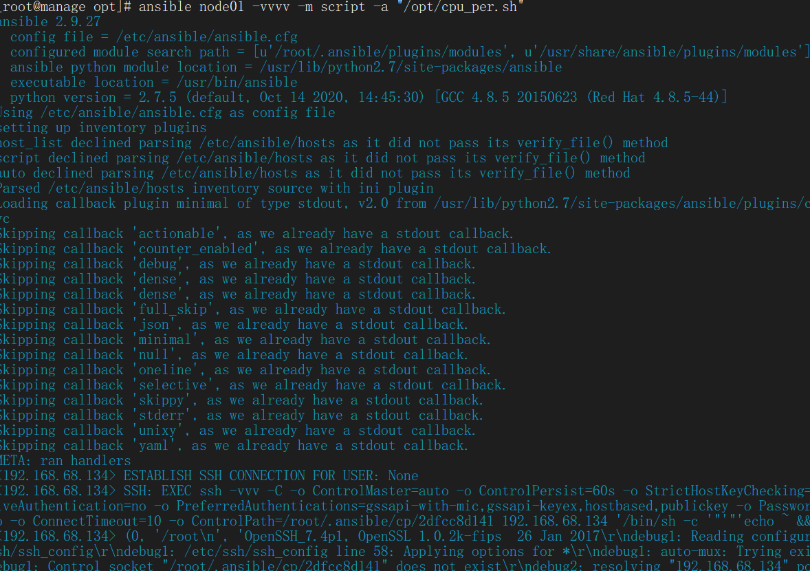 ansible node01 -vvvv -m script -a "/opt/cpu_per.sh"