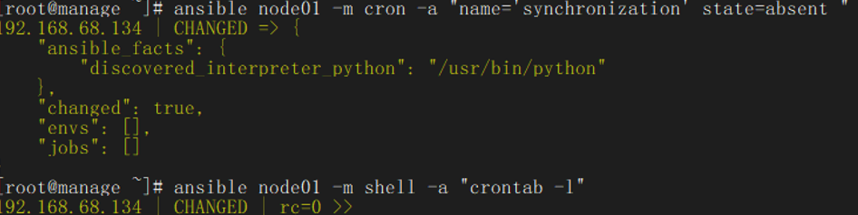 ansible node01 -m cron -a "name='synchronization' state=absent "