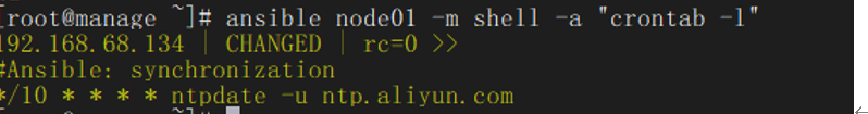 ansible node01 -m cron -a "name='synchronization' minute=*/10 job='ntpdate -u ntp.aliyun.com'"