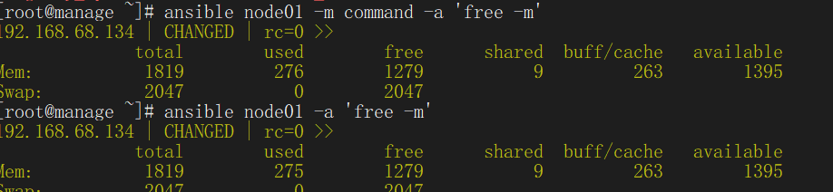 ansible node01 -m command -a 'free -m' => ansible node01 -a 'free -m'