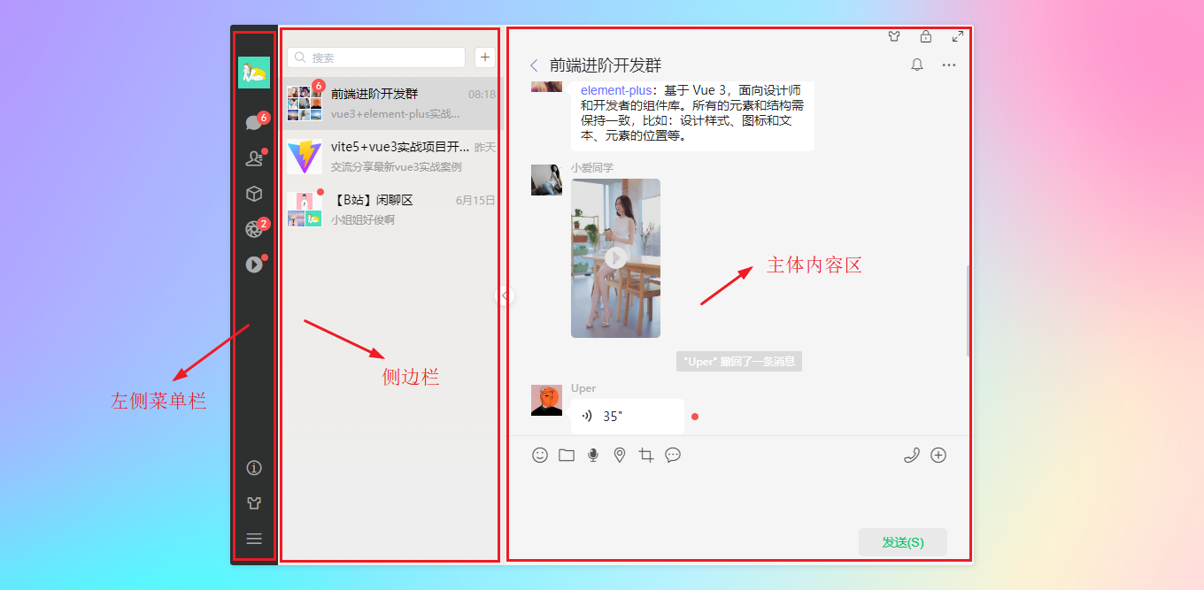 【摘要】 vite5-webchat原创实战vite5+vue3+vue-router+sass+pinia+element-plus搭建网页仿微信聊天系统。包含了聊天、通讯录、朋友圈、短视频、我的等模块。支持收缩侧边栏、桌面主题壁纸、锁屏等功能。
