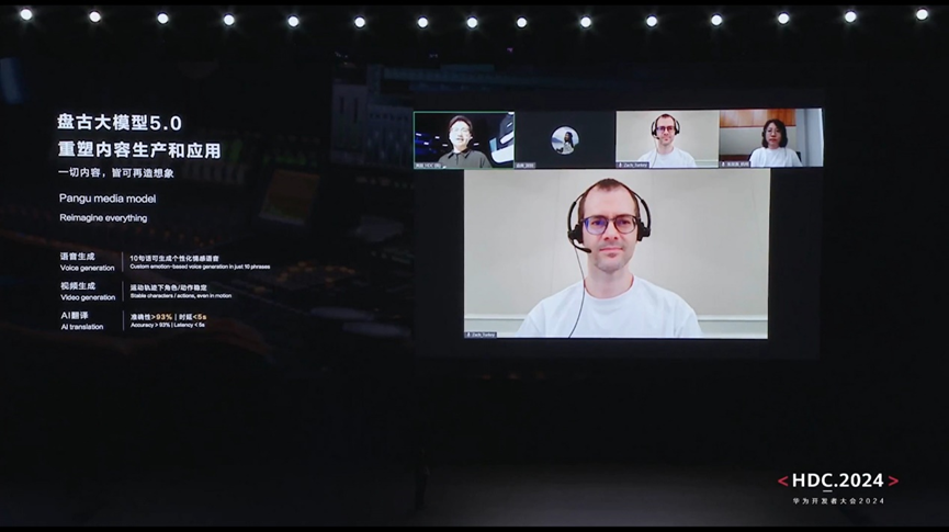 6月21日-6月23日,华为开发者大会(HDC 2024)在东莞松山湖正式举行。在首日的大会主题演讲中,华为常务董事,华为云CEO张平安介绍了盘古大模型在媒体领域的多项最新实践,其中就包括了应用于实时通信领域的AI同声传译能力。大会现场,国内外的参会者接入华为云会议,并各自用母语沟通,系统即可快速识别并实时翻译,每个人听到的都是母语,实现跨语种实时沟通。当参会者的数字人入会后,进一步实现了目标语言的口型匹配,成为当日会场的一大亮点。