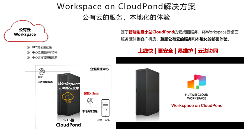 6月23日,在华为开发者大会2024期间,华为云正式发布了基于智能边缘小站CloudPond的云桌面服务,即Workspace on CloudPond解决方案。该方案将Workspace云桌面服务延伸到客户机房,兼顾公有云的服务和本地化的部署体验。目前,华为云是中国唯一支持公有云边缘部署云桌面全栈方案的厂商。