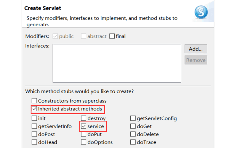 展开 Java Resources 目录,右击 src/main/java,New 一个 Servlet。填写包名和类名。点击Next,设置 URL Mapping。点击Next,勾选 Service 和 Inherited abstract methods。点击Finsih。