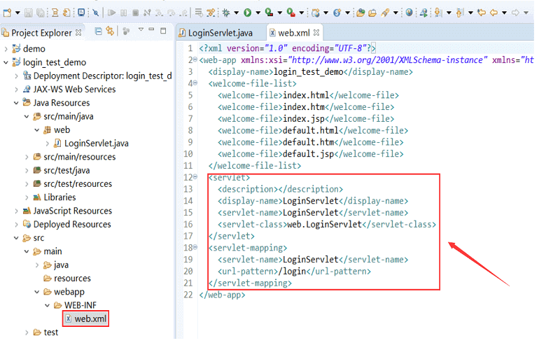 把 LoginServlet 配置到 Web.xml 里(如图)