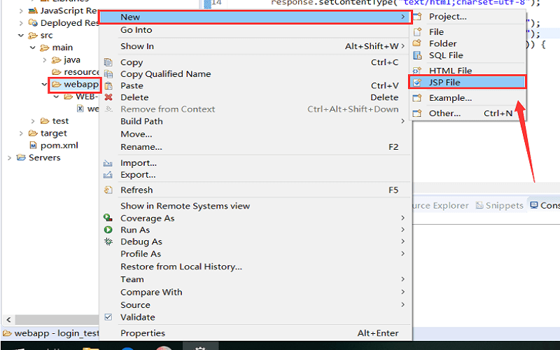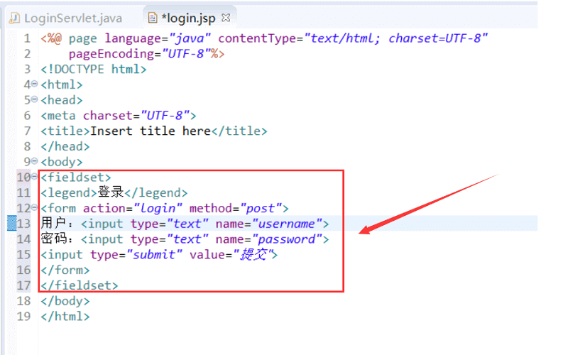 webapp 里新建 login.jsp,作为登录功能的前端界面。打开 login.jsp,编写html代码(如图)。