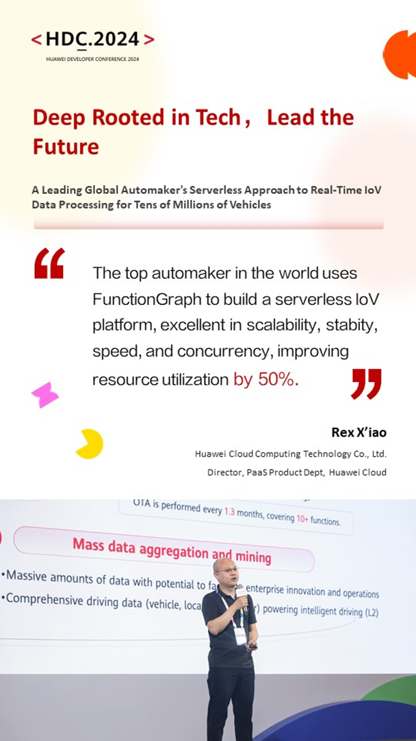 在华为开发者大会2024 “Deep Rooted in Tech, Lead the Future” 海外高峰论坛上,国内外嘉宾和专家齐聚一堂,交流华为领先技术及优秀行业案例。此间,华为云PaaS产品部海外产品总监肖振华在 “A Leading Global Automaker's Serverless Approach to Real-Time IoV Data Processing for Tens of Millions of Vehicles” 议题中分享了华为云FunctionGraph函数工作流在世界销量领先车企的实践故事,表示: