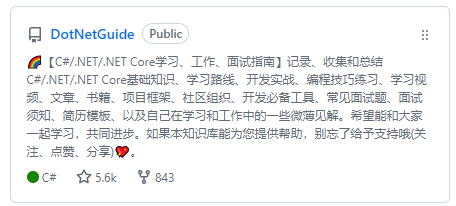 【摘要】 DotNetGuide简介记录、收集和总结C#/.NET/.NET Core基础知识、学习路线、开发实战、编程技巧练习、学习视频、文章、书籍、项目框架、社区组织、开发必备工具、常见面试题、面试须知、简历模板、以及自己在学习和工作中的一些微薄见解。希望能和大家一起学习,共同进步。如果本知识库能为您提供帮助,别忘了给予支持哦(关注、点赞、分享)💖。C#/.NET/.NET Core全面的学习、...