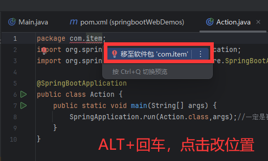 SpringApplication.run(Action.class,args);//一定是被@SpringBootApplication标记的类