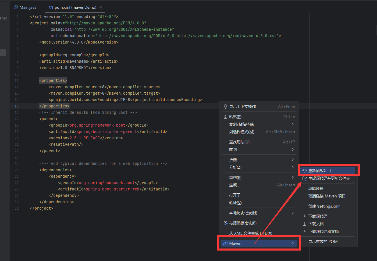 粘贴pom.xml文件的下图位置中,在右侧有Maven的刷新按钮。