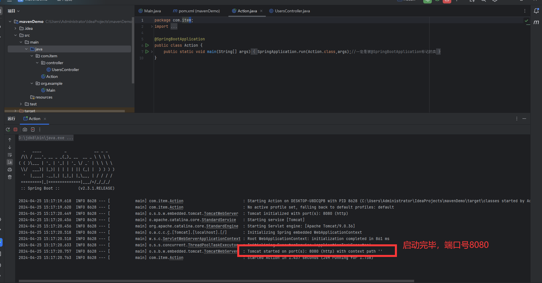 SpringApplication.run(Action.class,args);//一定是被@SpringBootApplication标记的类