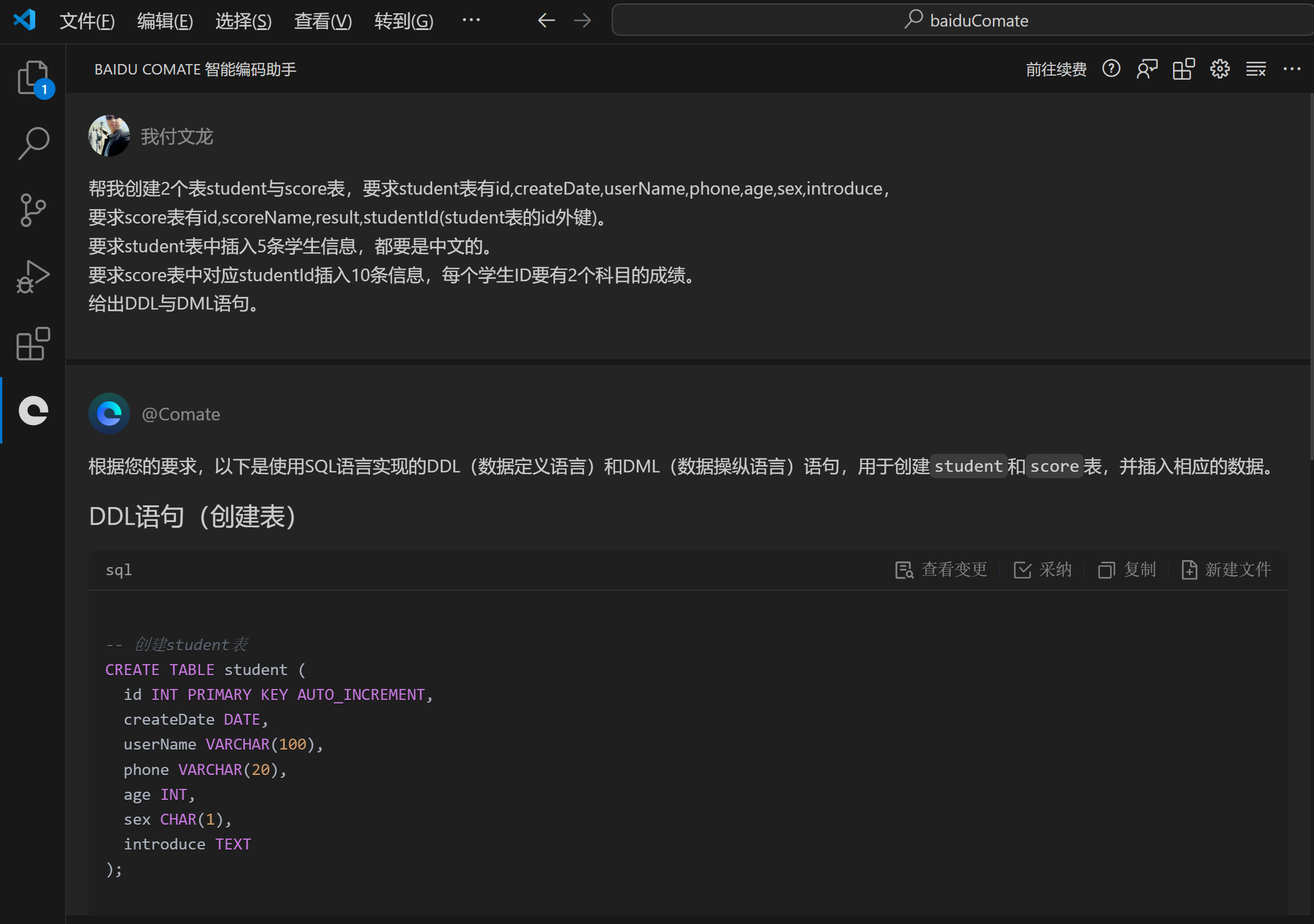 当我们需要比较复杂的表的时候,且我们有明确的列信息,就可以使用AI工具直接生成我们的DDL语句,如果需要插入一些DML语句也可以直接让其生成,自行执行插入即可。