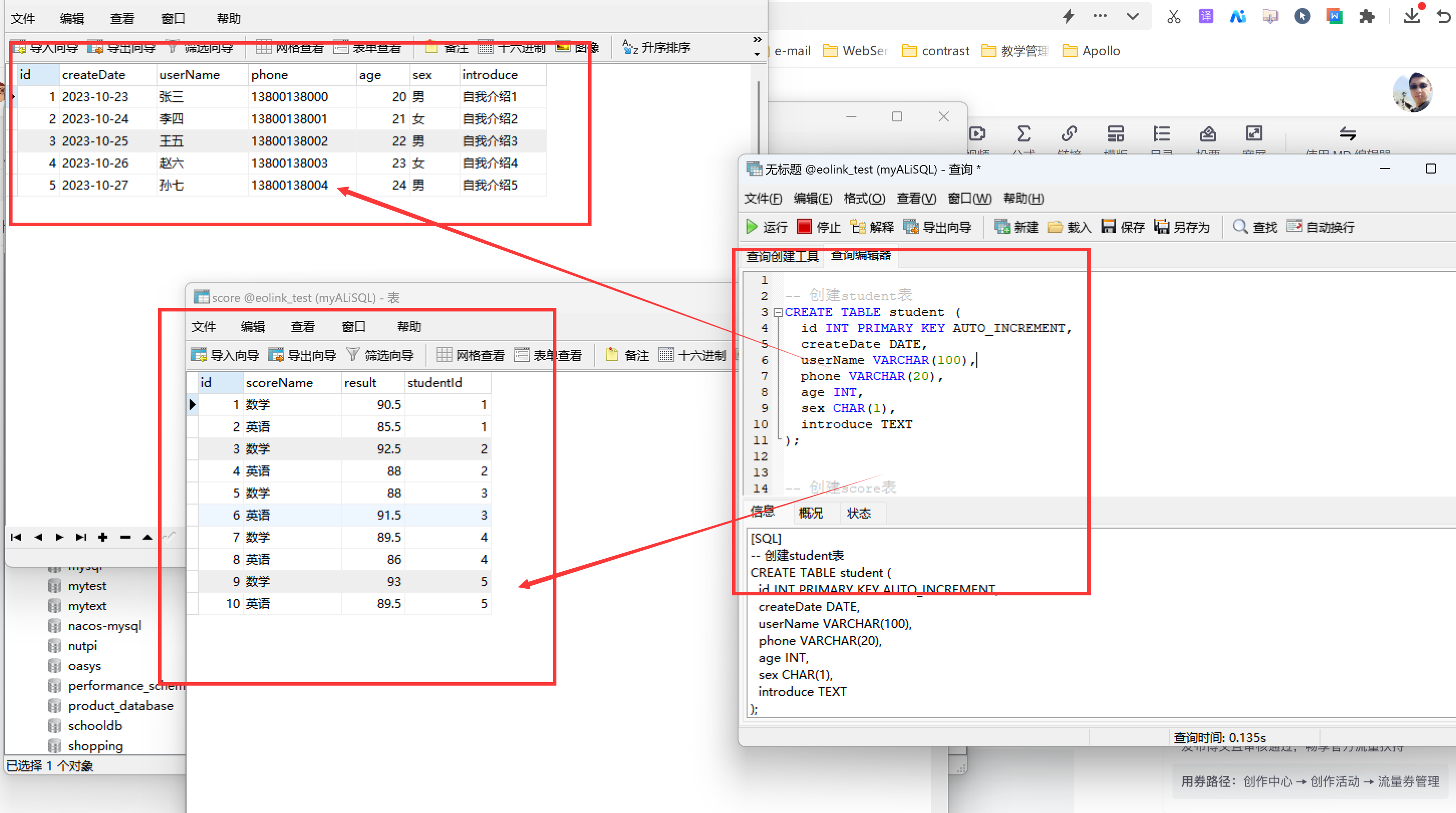 帮我创建2个表student与score表,要求student表有id,createDate,userName,phone,age,sex,introduce,