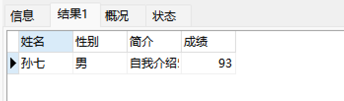 SELECT s.userName AS '姓名', s.sex AS '性别', s.introduce AS '简介', sc.result AS '成绩'FROM student sJOIN score sc ON s.id = sc.studentIdWHERE sc.result = (