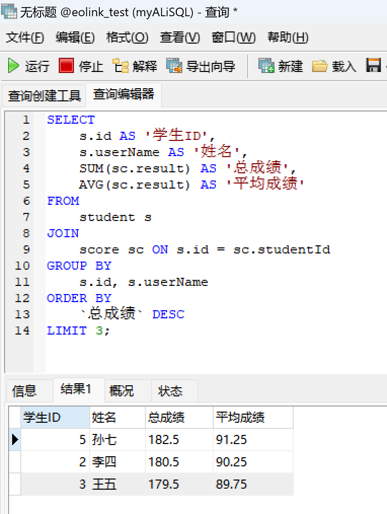 复杂SQL:帮我通过DDL语句写一个两表联查,要求根据学生的id进行分组,计算出成绩表学生的总成绩与平均成绩,并且根据总成绩进行倒序排列,只显示前三名的成绩,列名使用中文匿名,显示的信息不需要包含成绩表的id。