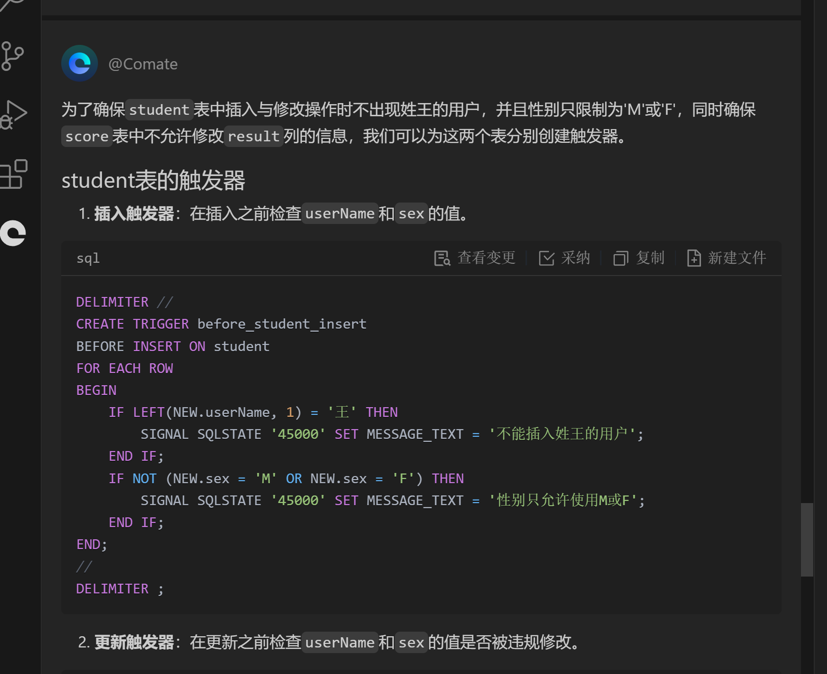 根据DDL分别写出两个表的触发器,student表插入与修改操作的时候不能出现姓王的用户,性别只允许使用M或F代表性别,score不允result列信息。