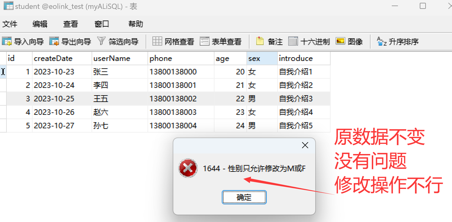 SIGNAL SQLSTATE '45000' SET MESSAGE_TEXT = '性别只允许修改为M或F';