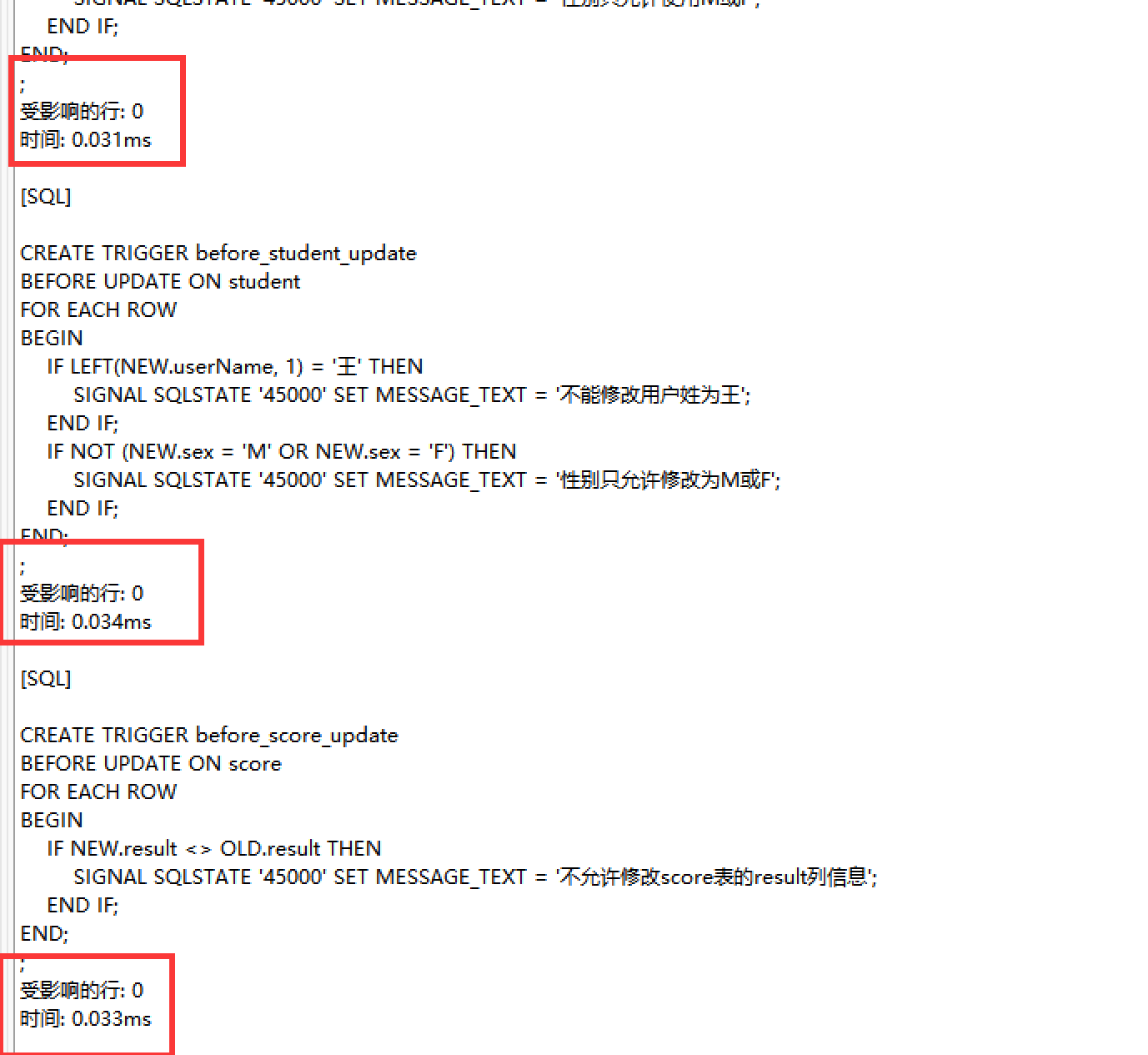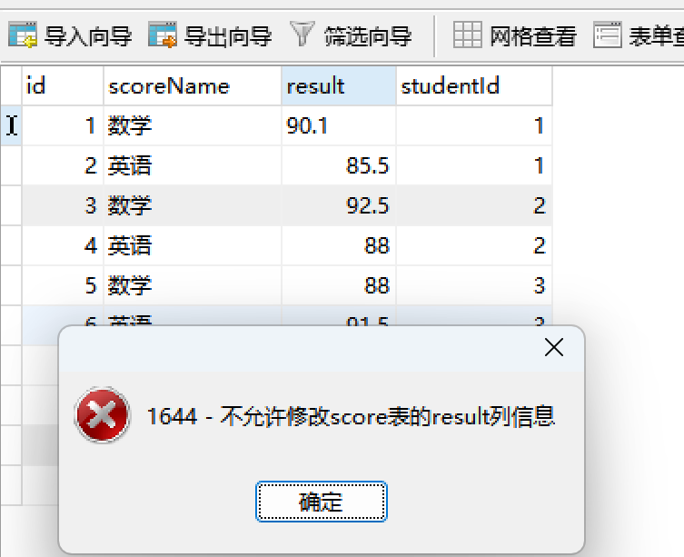 SIGNAL SQLSTATE '45000' SET MESSAGE_TEXT = '不允许修改score表的result列信息';