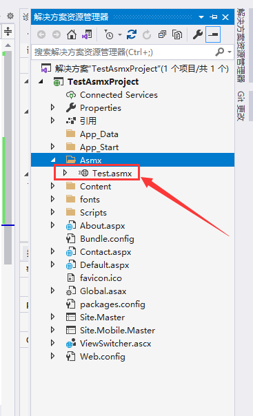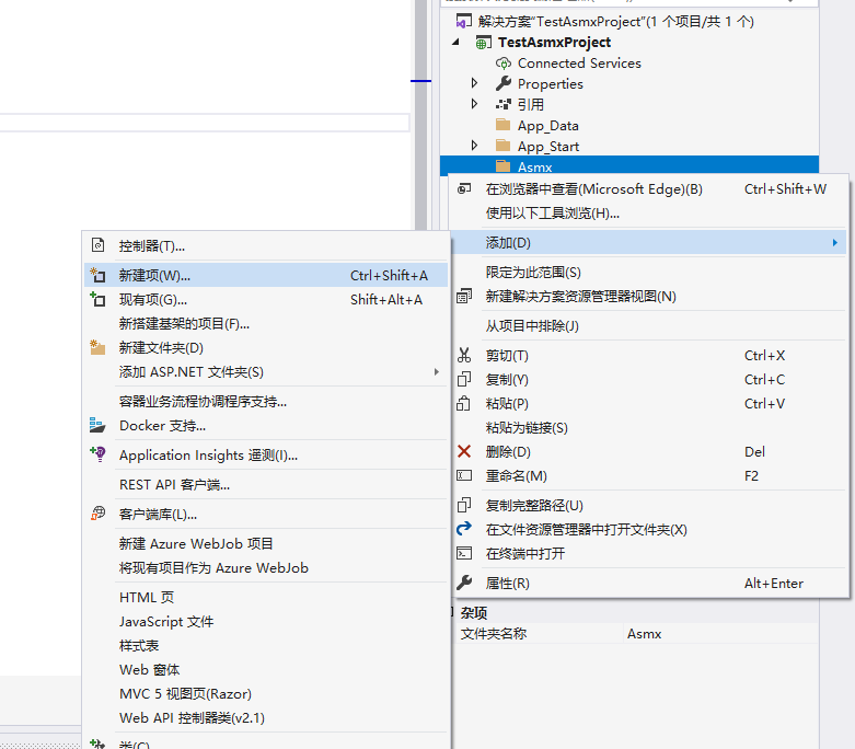 接着,我们创建 ASMX 文件。这里,我先创建了一个名为 Asmx 的文件夹,在文件夹里新建项。