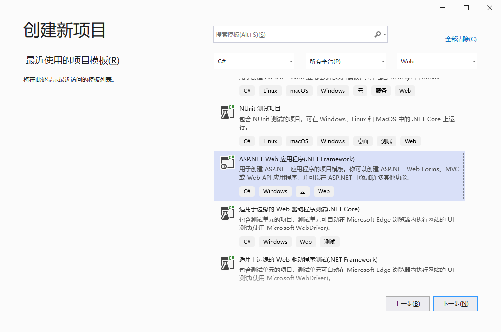 Visual Studio 2019 应用内新建项目,选择 ASP.NET Web应用程序(.NET Framework)。