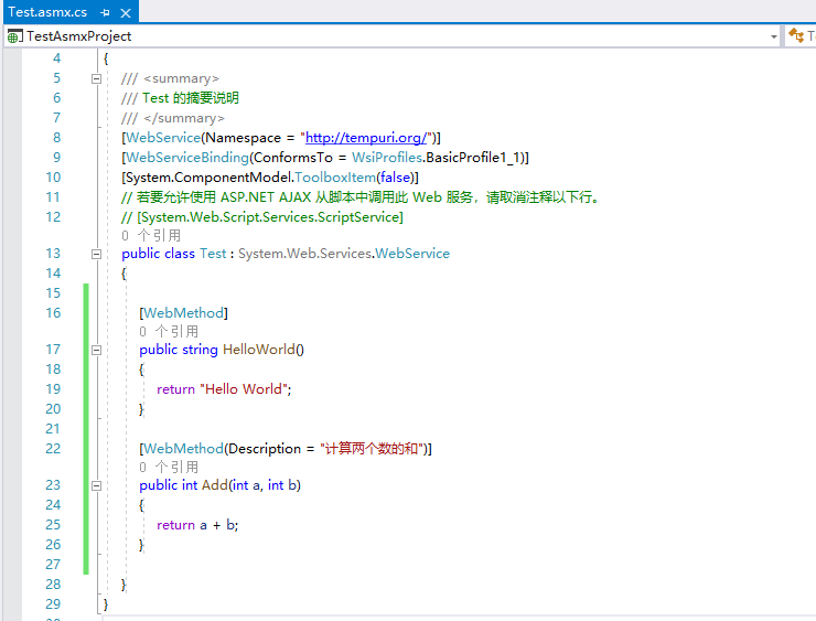 增加后,Test.asmx 代码如下: